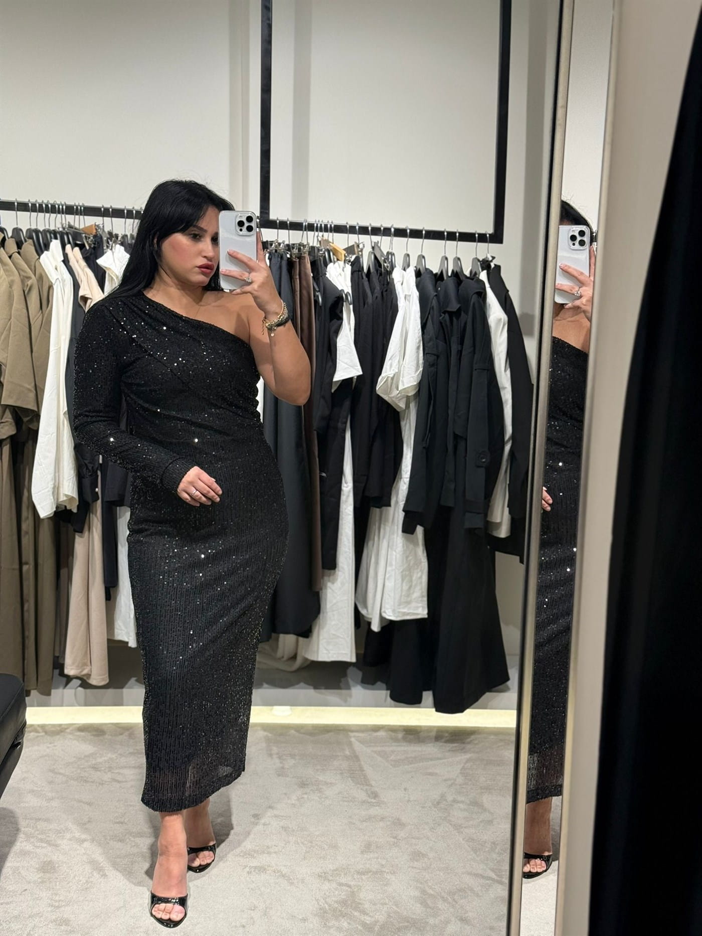 Işıltılı kumaşıyla gece davetlerinin en dikkat çekici parçası Tek omuz detaylı, zarif ve modern tasarımı ile