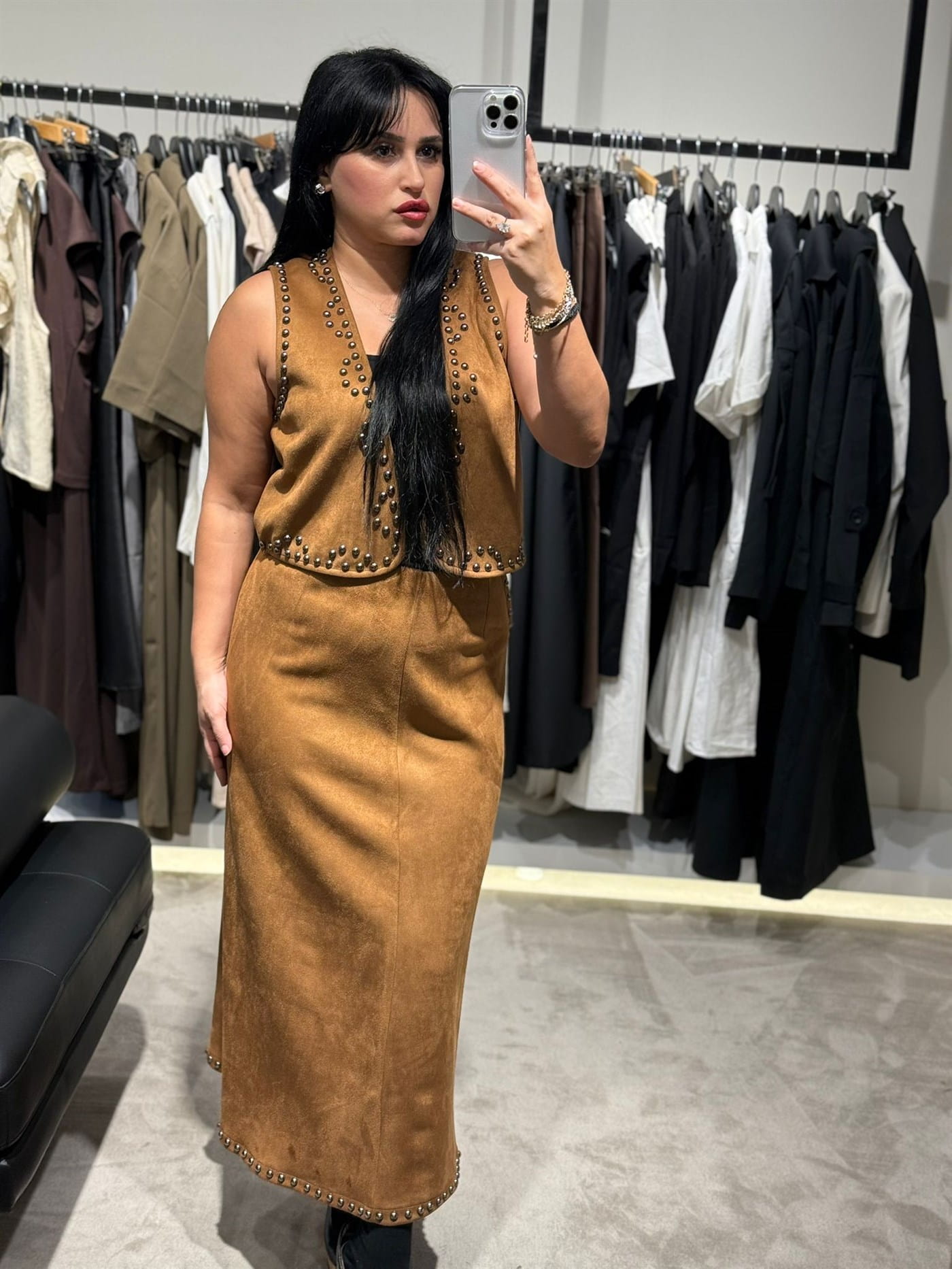 • Model: Süet görünümlü yelek ve etek takım